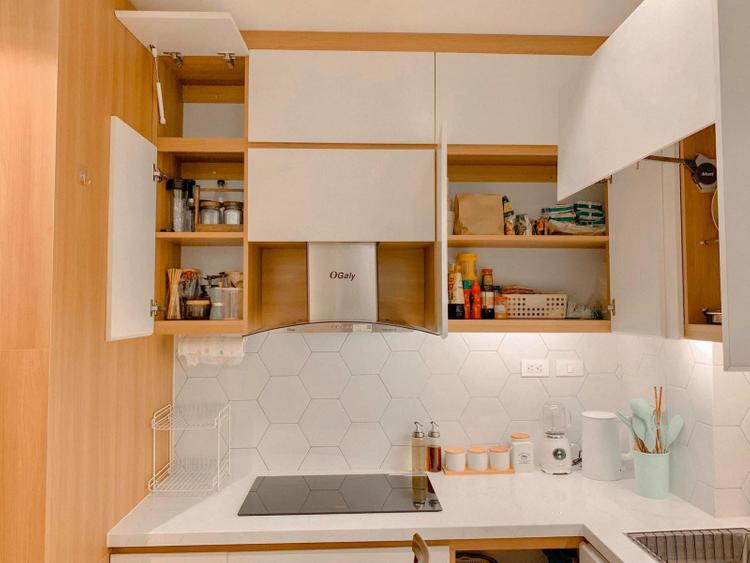 Vốn yêu thích nấu nướng, mày mò các món ăn mới, chị Gia Linh thường dành rất nhiều thời gian ở khu bếp. Chính vì thế, chị chăm chút và đầu tư rất nhiều cho khu vực này. Theo chị Gia Linh: "Bếp là nơi kết nối các thành viên trong gia đình, dù nhỏ nhưng phải thật gọn gàng, sạch sẽ, có vậy mới tạo cảm giác hứng khởi mỗi khi ở nhà".