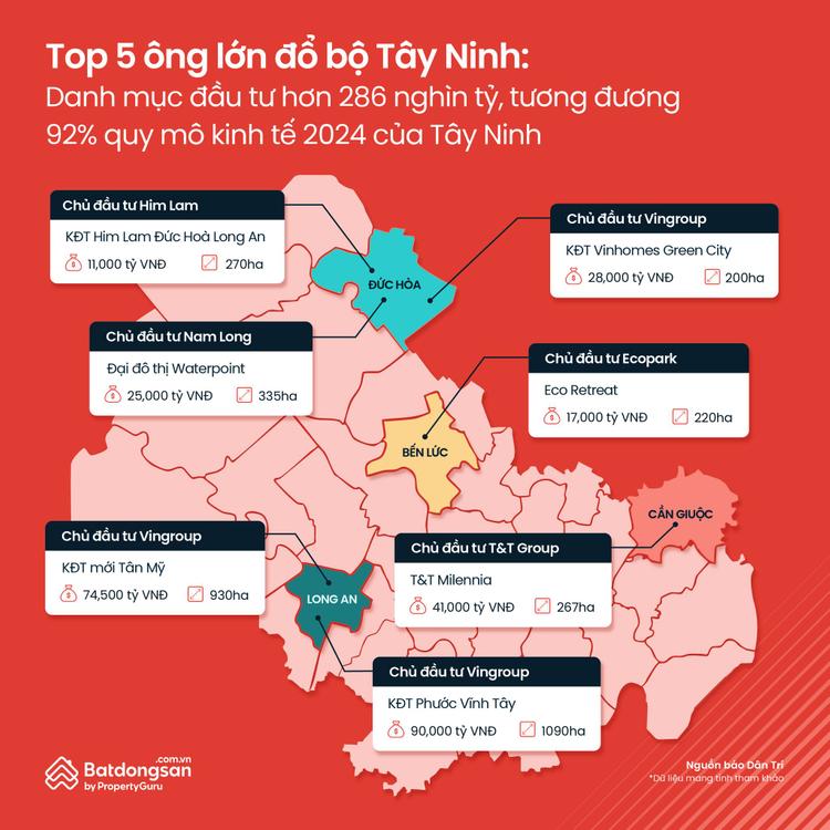 Vingroup là cái tên tiên phong, khi khởi công khu đô thị Vinhomes Green City quy mô gần 200 ha với tổng vốn đầu tư hơn 28.000 tỷ đồng, kỳ vọng kiến tạo một chuẩn mực sống mới cho thị trường bất động sản Tây Ninh. Cuộc đổ bộ của Vingroup không chỉ dừng lại với Vinhomes Green City mà còn được khẳng định dấu ấn với 2 dự án quy mô khác là khu đô thị Phước Vĩnh Tây với quy mô 1.090ha, tổng vốn đầu tư 90.000 tỷ đồng hay khu đô thị mới Tân Mỹ với quy mô 930ha, tổng vốn đầu tư hơn 74.000 tỷ đồng.