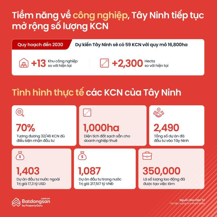 Tây Ninh đang khẳng định vị thế là điểm đến công nghiệp năng động của vùng kinh tế trọng điểm phía Nam. Hiện tỉnh đã quy hoạch 46 khu công nghiệp với tổng diện tích hơn 14.500 ha; trong đó, 32 khu đã hoàn thiện hạ tầng và đủ điều kiện đón nhà đầu tư, đạt tỷ lệ lấp đầy gần 70%.