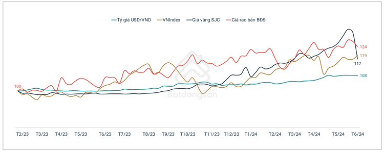 Nhìn lại thời gian qua, sau nhiều biến động, bất động sản vẫn được cho là kênh đầu tư có lợi suất tốt nhất tại Việt Nam. Theo dữ liệu của Batdongsan.com.vn và dữ liệu tổng hợp từ Cục Dự trữ Liên bang Mỹ (FED) và Quỹ Tiền tệ Quốc tế (IMF), giá rao bán bất động sản tại Việt Nam vào tháng 6/2024 đã tăng 24% so với thời điểm tháng 2/2023. Tiềm năng sinh lời này vượt mức tăng trưởng của một số loại hình đầu tư phổ biến khác như chứng khoán (VNIndex tăng 19%) và vàng (giá vàng SJC tăng 17%).