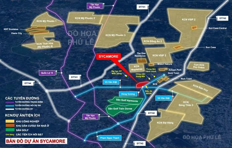Vị trí dự án Sycamore nằm ngay mặt tiền đại lộ Hùng Vương rộng 80m với 12 làn đường thuộc thành phố mới Bình Dương. Vị trí rất đẹp khi đáp ứng được 3 tiêu chí là "Nhất cận thị, nhị cận giang, tam cận lộ" mang đến cho vị trí trở nên đắc địa cũng như là giúp dự án tiếp cận đến các tiện ích trong khu vực dễ dàng.