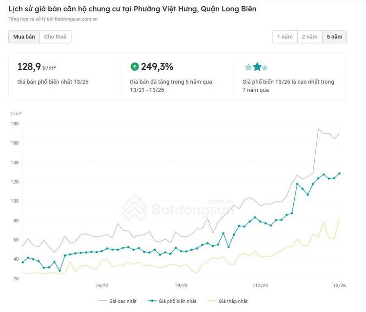 Giá bán căn hộ tại phường Việt Hưng đã tăng 249,3% trong vòng 5 năm qua.