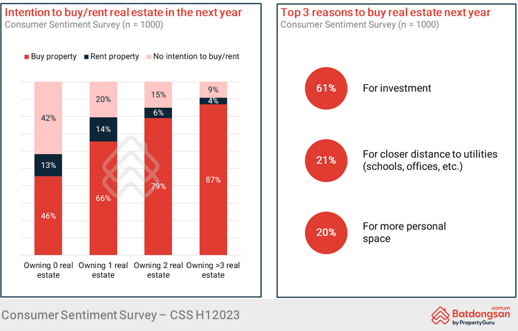 Báo cáo cũng phản ánh 68% người tham gia khảo sát cho biết họ sẽ mua BĐS trong vòng 1 năm tới. Càng nắm giữ nhiều nhà, đất, xu hướng muốn mua thêm của người tiêu dùng càng tăng. Tỷ lệ người dự định mua BĐS trong tương lai gần là 46% với đối tượng chưa có nhà, 66% với những người đã có một BĐS và lên đến 87% ở những người đã làm chủ từ 3 BĐS trở lên. Trong đó, những BĐS sơ cấp trong tầm giá 2,5 – 5 tỷ đồng thu hút lượng quan tâm lớn.