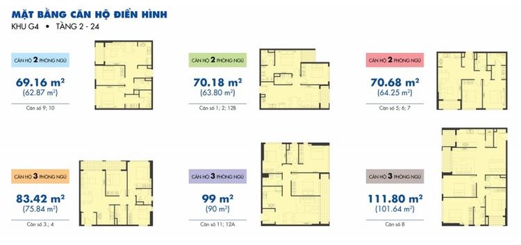 Tầng điển hình của tháp G4 gồm 13 căn hộ trên 1 sàn với 2 loại căn hộ: 2 phòng ngủ, 3 phòng ngủ, diện tích nhỏ nhất 69,16m2, lớn nhất 111,80m2. Mỗi căn hộ chung cư đều được thiết kế hiện đại, sang trọng với đầy đủ công năng.