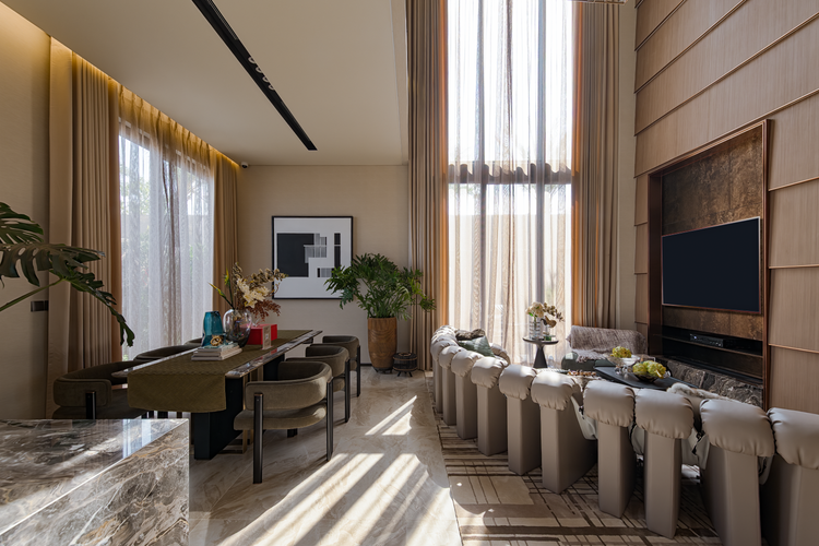 Ảnh thực tế: Tại căn biệt thự Twin Villa, phòng khách được kết nối liền mạch với phòng ăn, mang đến không gian sinh hoạt gần gũi và ấm áp.