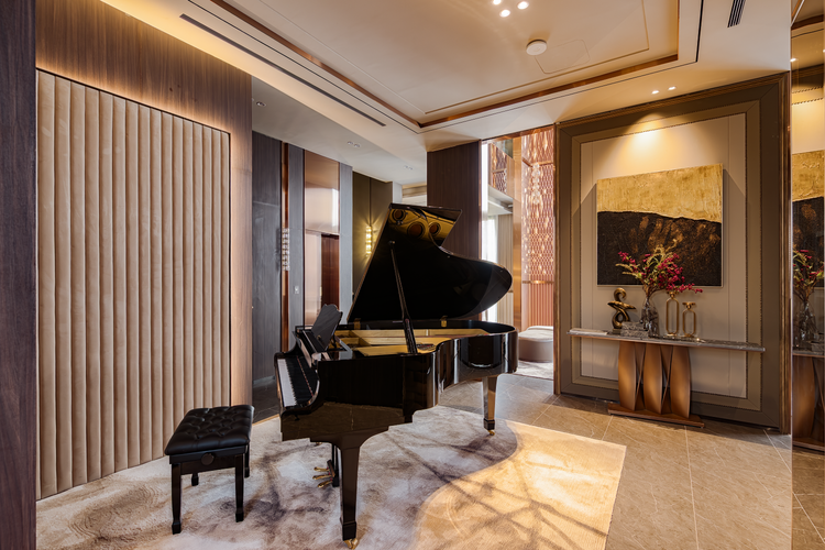 Ảnh thực tế: Sảnh chờ được bài trí với cây đàn grand piano 3 chân – một khoảng dừng chân tinh tế trước khi bước vào không gian chính của tư gia.
