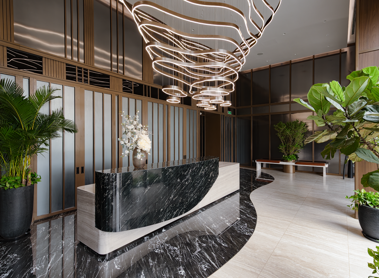 Ảnh thực tế: Khu vực sảnh chính của Clubhouse The Fullhaus là điểm chạm đầu tiên, đưa cư dân tinh anh bắt đầu hành trình trải nghiệm hệ tiện ích nghỉ dưỡng ngay tại gia.