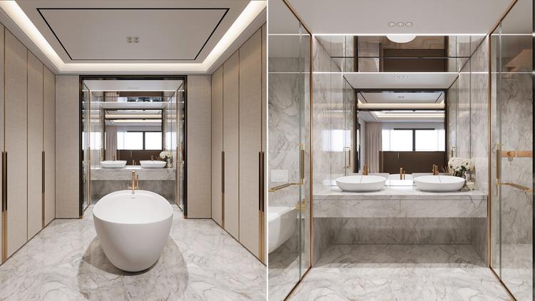 Từ bồn tắm, hệ sen vòi, bồn cầu âm tường, vách kính cường lực cho đến tủ lavabo chống ẩm cao cấp, tất cả được bố trí theo ngôn ngữ tối giản nhưng chuẩn xác, tôn vinh sự tinh khiết của không gian. Ánh sáng được xử lý tinh tế qua hệ gương LED và chiếu sáng gián tiếp, kết hợp cùng hệ thông gió và giải pháp kỹ thuật hiện đại, tạo nên một môi trường thư giãn cân bằng giữa thẩm mỹ và công năng.