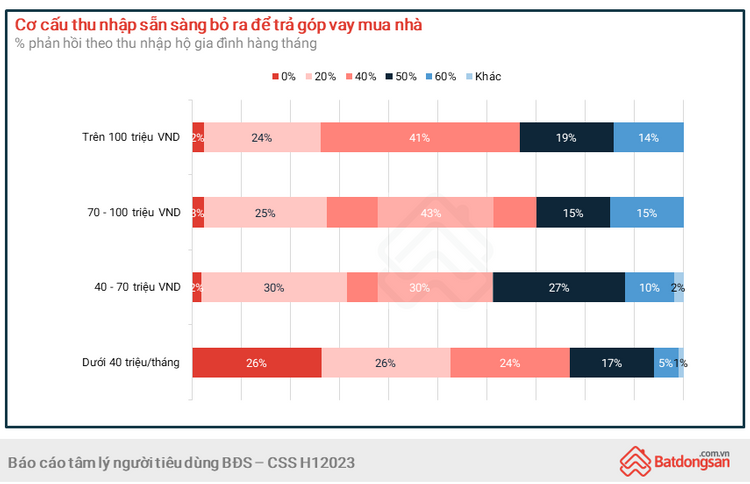 Theo khảo sát của Batdongsan.com.vn, ở những người có thu nhập hộ gia đình dưới 40 triệu/tháng, tỷ lệ sẵn sàng dành khoảng 40% – 60% tổng thu nhập cho khoản trả góp vay mua nhà là 46%. Tỷ lệ này tăng lên với các đối tượng có thu nhập hộ gia đình cao hơn, cụ thể là 67% ở những người có thu nhập 40 – 70 triệu/tháng, 73% ở những người có thu nhập 70 -100 triệu/tháng và 74% với những người có thu nhập hàng tháng trên 100 triệu.