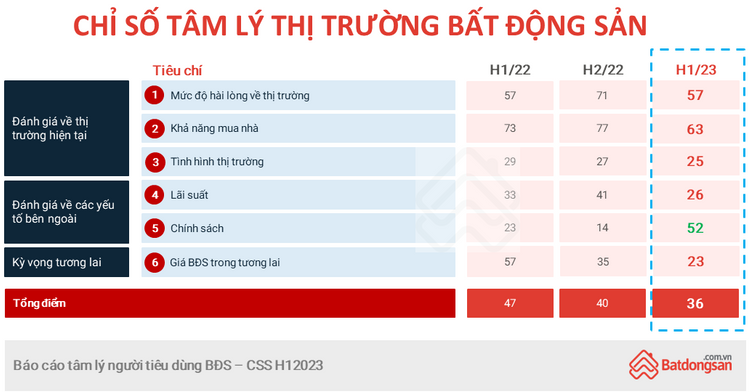 Theo đó, Chỉ số tâm lý thị trường BĐS Việt Nam đầu năm 2023 là 36 điểm, giảm khá nhiều so với mức 47 và 40 điểm của nửa đầu và nửa cuối năm 2022. Trong đó, mức độ lạc quan của người mua/bán BĐS sụt giảm mạnh nhất đối với lãi suất vay mua BĐS (giảm 15 điểm). Nếu như nửa năm trước, 41% người tham gia khảo sát cho rằng lãi suất ngân hàng đang ở mức hợp lý, thì hiện tại, chỉ còn 26% đồng tình với chính sách lãi suất, hầu hết đều đánh giá lãi suất đang ở mức cao hoặc quá cao.