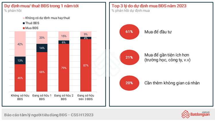 Khi được hỏi về dự định mua BĐS, 68% người tham gia khảo sát của Batdongsan.com.vn cho biết họ sẽ mua trong vòng 1 năm tới. Càng nắm giữ nhiều BĐS, xu hướng muốn mua thêm nhà, đất của người tiêu dùng càng tăng. Tỷ lệ người dự định mua BĐS trong năm 2023 là 46% với đối tượng chưa có BĐS nào, 79% với những người đang sở hữu 2 BĐS và lên đến 87% ở những người đã có trên 3 sản phẩm địa ốc.