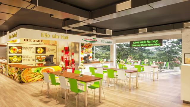 Khi hoàn thành, khu foodcourt này sẽ hội tụ khoảng 100 gian hàng ẩm thực. Trong đó, một nửa diện tích khu foodcourt là nơi tập trung các quán ẩm thực bản địa đặc trưng của Đà Lạt như: Bánh tráng nướng, quán bánh căn, lẩu gà hột é, heo rừng, bún riêu Đà Lạt hay cơm Lam… Tại không gian ẩm thực bản sắc địa phương này, du khách sẽ được thưởng thức trọn vẹn phong vị ẩm thực của thành phố sương mù.