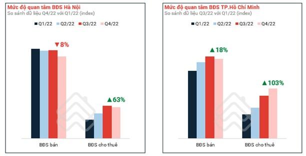 Đầu năm 2022, Batdongsan.com.vn lại đưa ra dự báo, dòng tiền sẽ sớm quay lại thị trường miền Nam. Thực tế, BĐS khu vực miền Nam, đặc biệt là tại TP. Hồ Chí Minh đang chứng kiến lượng quan tâm tăng mạnh hơn so với nhiều tỉnh phía Bắc. Trong quý 4/2022, lượt tìm mua BĐS tại TP. Hồ Chí Minh ước tính tăng 18% so với quý 1/2022, trong khi con số này của Hà Nội lại giảm 8%. Nhu cầu tìm thuê BĐS ở cả 2 thành phố đều hồi phục tốt trong năm 2022 nhưng TP. Hồ Chí Minh chứng kiến tốc độ hồi phục mạnh mẽ hơn với mức độ quan tâm tới BĐS cho thuê tăng 103% so với đầu năm, trong khi Hà Nội tăng 63%.