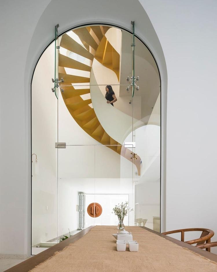 Điểm nhấn của ngôi nhà là chiếc cầu thang ngoài trắng trong vàng, tựa như xương sống kết nối các tầng lại với nhau. Nó vừa có tác dụng lấy sáng, vừa cản một phần ánh sáng từ giếng trời phía trên. Khoảng không gian vừa đủ ở giữa nhà mang theo gió, ánh sáng luân chuyển khắp mọi nơi giúp kết nối mọi không gian trong nhà với nhau một cách hài hòa.