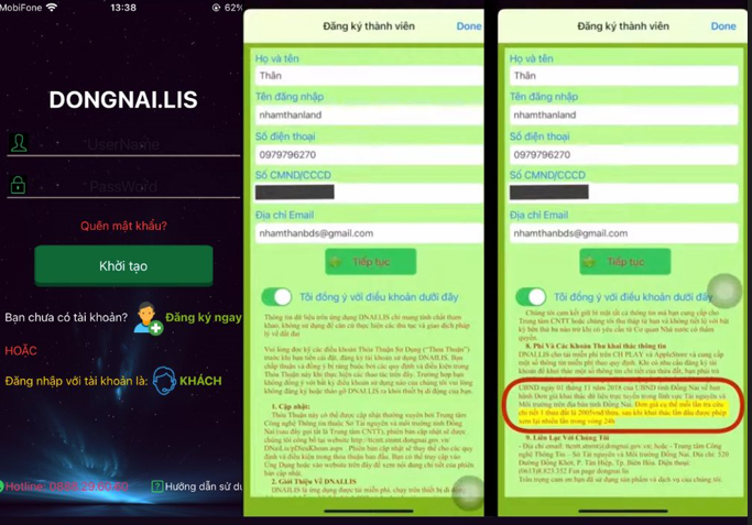 Ví dụ: App ở ảnh minh họa sau đây là App DNAILIS dành cho tỉnh Đồng Nai. Bạn đăng ký tài khoản để truy cập và tra cứu. Llưu ý, bạn có thể xem ở chế độ khách nhưng app sẽ không cho phép bạn xem thông tin một cách cụ thể về thửa đất bạn muốn tra cứu.