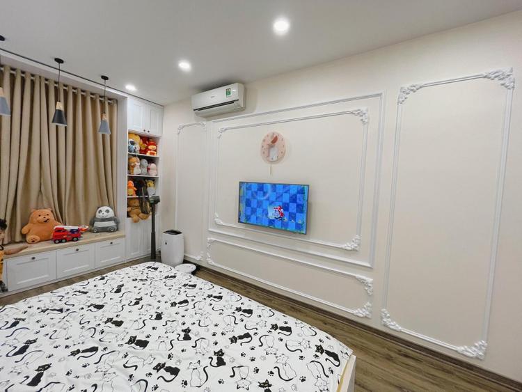 Phòng ngủ sau khi được cải tạo. Gia chủ bỏ tủ tivi để hai con không bị vướng víu khi chơi đùa. Phòng chưa được làm phào.