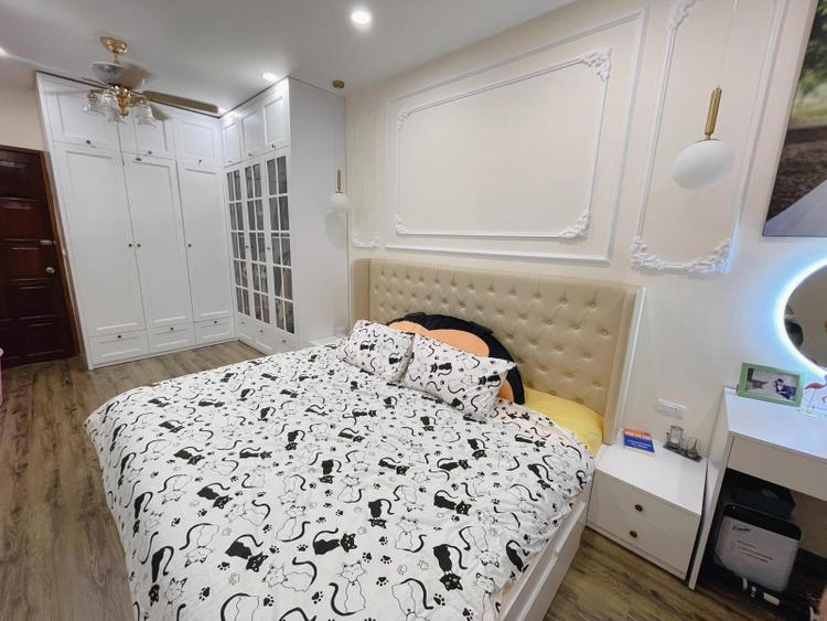 Đồ đạc đều được mua từ ngày cưới nên khi có con không đủ sức chứa làm phát sinh thêm nhiều đồ hơn. Giường 1,8m không đủ chỗ cho 4 người nên phải kê thêm giường phụ. Tủ quần áo cũng thiếu chỗ để. Sàn bị mối mọt nên anh chị phải trải thảm.