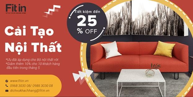25% Gói Cải Tạo Nhà. Trong đó bao gồm: Miễn phí tư vấn và thiết kế 3D; Giảm 25% cho những đơn hàng nội thất (Bộ nội thất rời) – Tiết kiệm thêm 10% (ưu đãi tổng cộng đến 35%) cho 10 khách hàng đăng ký đầu tiên trong tháng 5.