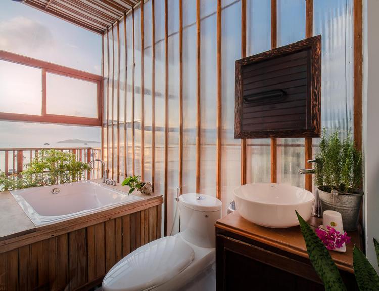 Khu vực bồn tắm và nhà vệ sinh cũng được thiết kế hướng biển mang đến cho gia chủ những trải nghiệm thú vị