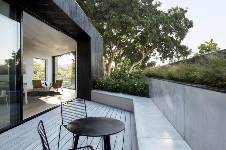 Giải pháp thiết kế cũng hướng đến việc tích hợp công năng vào từng chi tiết nhằm làm phong phú thêm lối sống gia đình. Ở đây, phần ban công của tầng 1 vừa là nơi trồng cây, vừa để bố trí tủ lưu trữ và bàn ghế thư giãn ngoài trời.