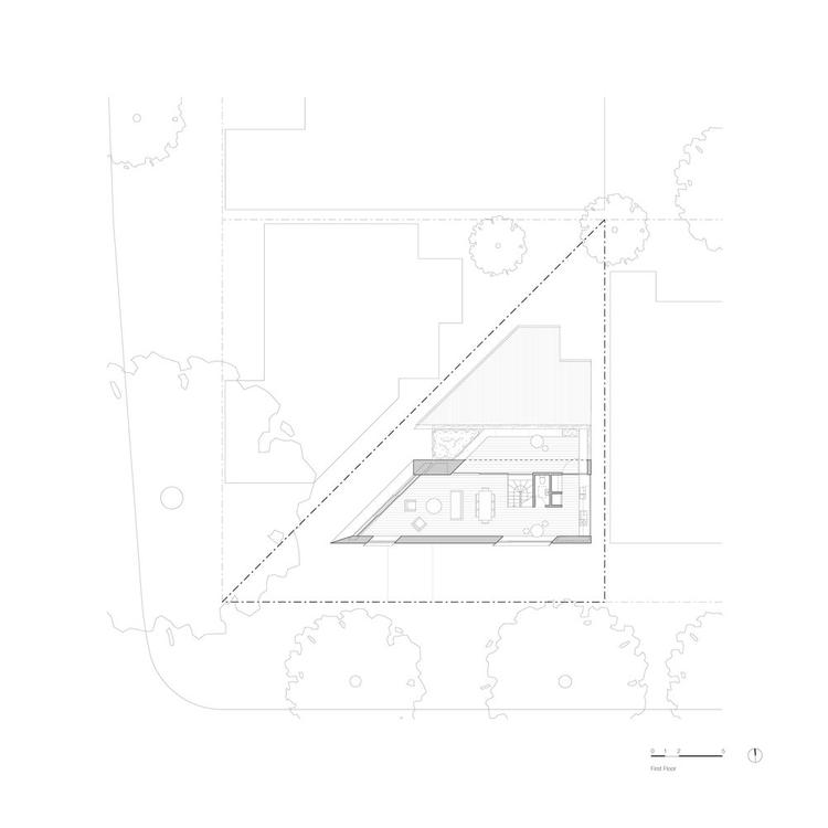 Đáp trả lại hình dạng dị thường của mảnh đất, những đường xiên chéo hiện diện ở khắp nơi trong ngôi nhà, từ cửa sổ cho đến khu vực thư giãn ngoài trời.