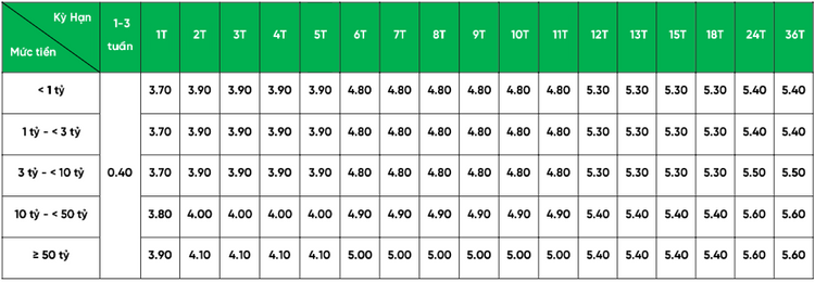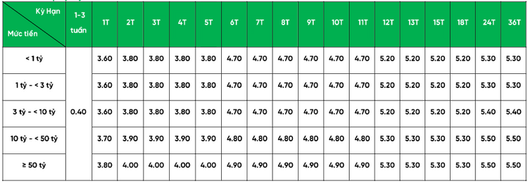 Ngân hàng TMCP Việt Nam Thịnh Vượng (VPBank) đang áp dụng khung lãi suất gửi tiết kiệm từ 3,6-5,6%/năm, áp dụng cho các kỳ hạn từ 1 đến 36 tháng, trả lãi cuối kỳ. Ngân hàng này cũng triển khai 5 nhóm hạn mức tiền gửi khác nhau, bao gồm: hạn mức gửi dưới 1 tỷ đồng, từ 1 tỷ đến dưới 3 tỷ đồng, từ 3 tỷ đến dưới 10 tỷ đồng, từ 10 tỷ đến dưới 50 tỷ đồng và trên 50 tỷ đồng.