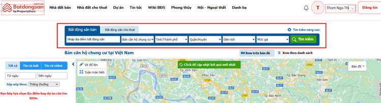 Cách 2: Trên giao diện tìm kiếm nhập từ khóa liên quan đến bất động sản hoặc khu vực/ dự án muốn tìm kiếm và nhấn nút "Tìm"