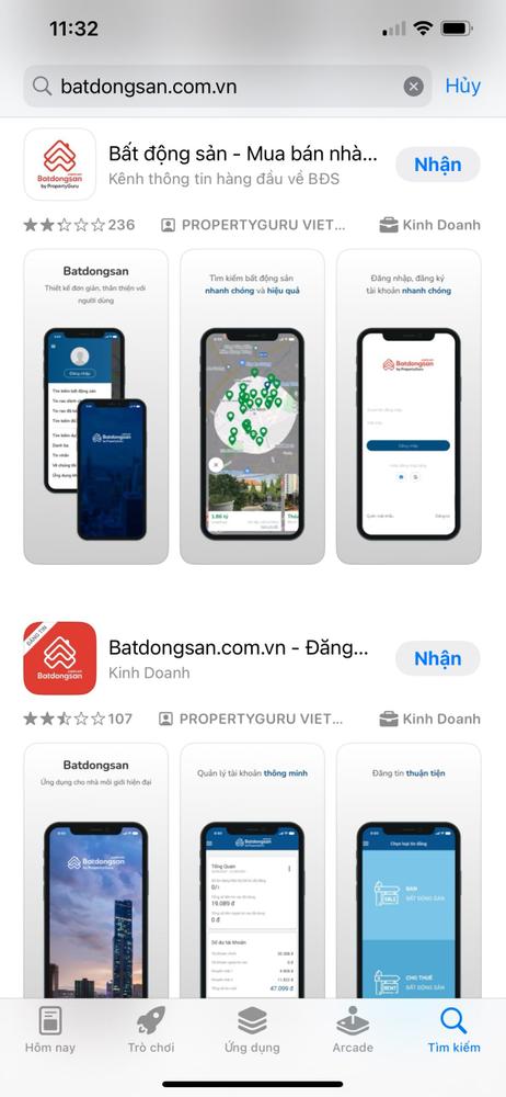 Cách 2: Vào App Store (hệ điều hành iOS) hoặc CH Play (hệ điều hành Android), ở phần tìm kiếm gõ: Batdongsan.com.vn. Chọn ứng dụng Batdongsan.com.vn để tải về như hình: