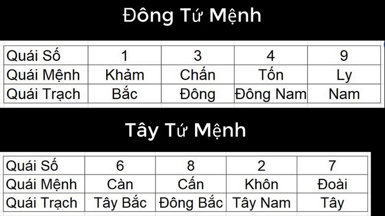 Đông Tứ Mệnh: Là những người có Quái số 1, 3, 4, 9. Các hướng hợp mệnh (Cát): Đông, Đông Nam, Nam, Bắc.