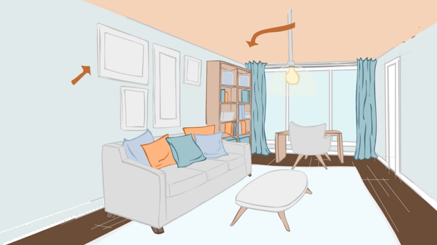 Hướng tầm mắt lên cao bằng cách tận dụng không gian dọc. Một giá sách hay kệ lưu trữ cao sẽ có tác dụng “bẻ gãy” không gian dài theo chiều ngang. Hướng ánh mắt lên phía trên bằng cách bố trí tranh ảnh, tác phẩm nghệ thuật ở trên cao, gần sát với trần nhà. Treo rèm với họa tiết sọc dọc từ trần xuống sàn nhà để tạo ảo giác về chiều cao.