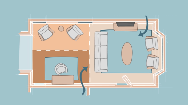 Thêm một cách phá vỡ không gian quá dài đó là tạo ra một đường cong xuyên suốt căn phòng. Điều này sẽ đạt được khi bạn bố trí nội thất dọc theo cả hai bức bức tường dài và chia không gian thành hai khu vực riêng biệt. Bạn có thể tự mình phác thảo ý tưởng này trên giấy hoặc sử dụng ứng dụng thiết kế nội thất miễn phí để dễ dàng hình dung về lối đi uốn cong. Chẳng hạn, dưới đây là hai khu vực tạo ra lối đi cong trong một phòng khách hẹp và dài: