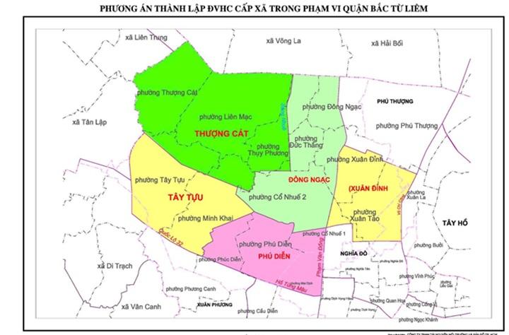 Trước khi sáp nhập, quận Bắc Từ Liêm có tổng số 13 phường. Sau khi thực hiện sáp nhập, quận Bắc Từ Liêm có 5 phường mới gồm: Phường Tây Tựu, phường Phú Diễn, phường Xuân Đỉnh, phường Đông Ngạc, phường Thượng Cát. Các phường được sắp xếp cụ thể như sau: