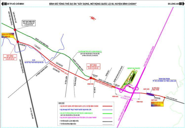 Dự án mở rộng Quốc Lộ 50 (địa phận huyện Bình Chánh) là một trong những dự án hạ tầng trọng điểm của TP.HCM, mở lối lưu thông về các tỉnh Miền Tây sẽ được khởi công vào tháng 12/2022. Dự án này có mục tiêu giải quyết tình trạng ùn tắc giao thông và tăng cường kết nối giữa TP.HCM và tỉnh Long An.
