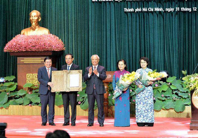 Phó chủ tịch Quốc hội Uông Chu Lưu trao nghị quyết thành lập thành phố Thủ Đức cho lãnh đạo TPHCM.