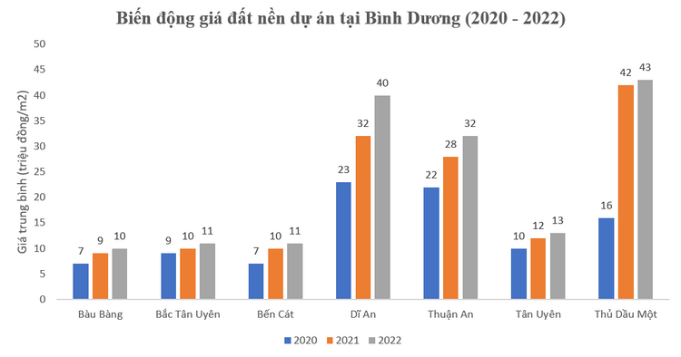 Với đất nền và đất nền dự án, thành phố Thủ Dầu Một và Dĩ An dẫn đầu mức giá trung bình 22-43 triệu/m2, tăng 30-60% từ năm 2020 đến năm 2021, đến năm 2022 chỉ tăng nhẹ 5%. Các huyện Bàu Bàng, Bắc Tân Uyên, thị xã Bến Cát, thị xã Tân Uyên chỉ tăng 20% và giữ vững giá 7-11 triệu/m2 trong 3 năm.