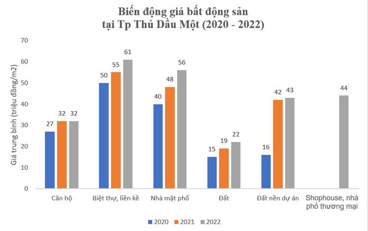 Theo số liệu từ Batdongsan.com.vn, từ năm 2020 đến đầu năm 2022, bất chấp dịch bệnh, giá bán trung bình các loại hình bất động sản tại Bình Dương vẫn giữ vững giá hoặc tăng nhẹ, chỉ có biệt thự, liền kề giảm khoảng 6%.