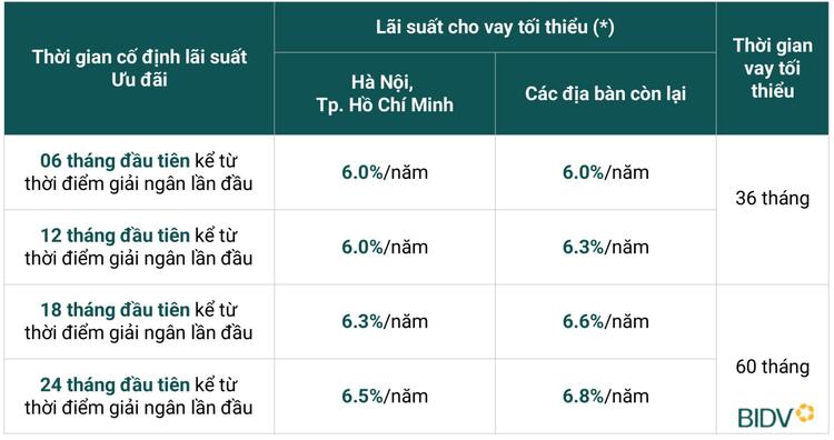 Với chính sách lãi suất luôn luôn tốt nhất thị trường từ 6%/năm, thời gian vay tối đa lên tới 30 năm và hạn mức cho vay đến 100% phương án vay vốn, sản phẩm vay mua nhà BIDV vinh dự được Tạp chí danh tiếng The Asian Banker trao giải “Sản phẩm vay nhà ở tốt nhất Việt Nam” 5 năm liền.